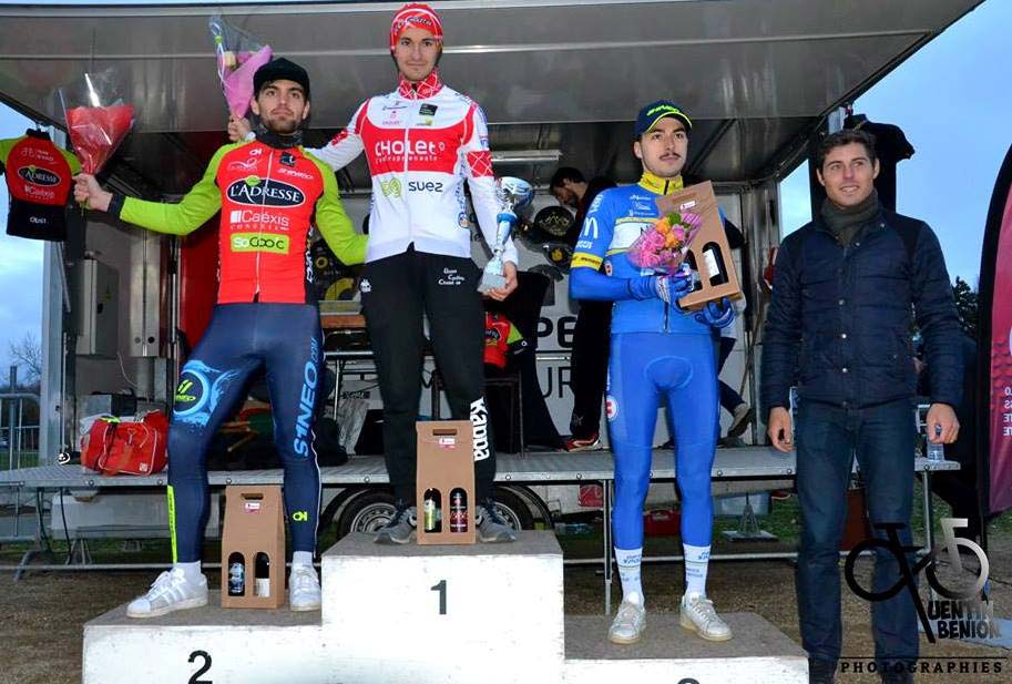 Adrien Leboucher (Team U Nantes Atlantique) termine sur la troisième place du podium du cyclo-cross d’Angers Lac de Maine, devancé par Kévin Groussard (UC Cholet 49) et Clément Normand (EV Angers Doutre).